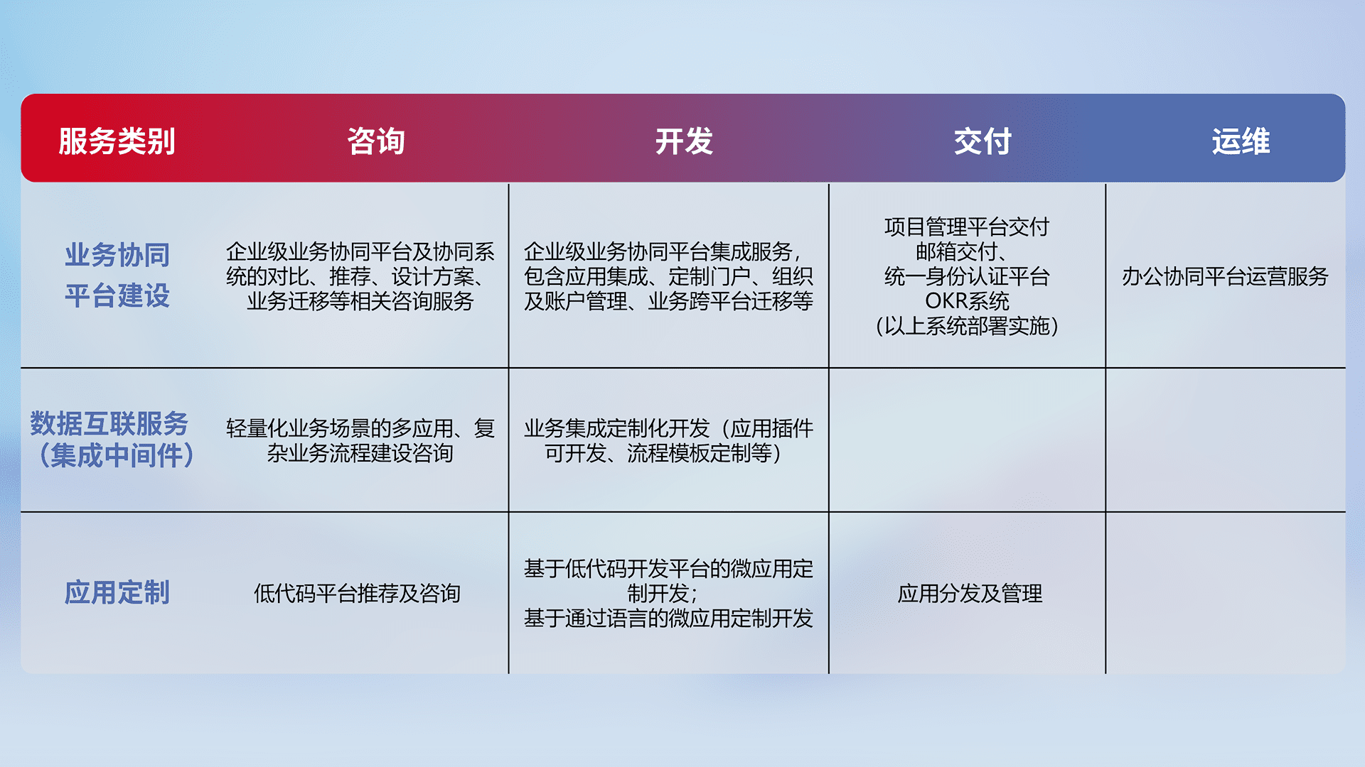 针对钉钉、、企微、、、、IDaas等平台级产品提供产品的规划、、、方案、、交付、、、、定制化开发等服务,,实现如统一协同办公、、智能客户服务、、混合会议管理、、、智能数据查询、、、等业务场景,,实现数字化转型。。。。